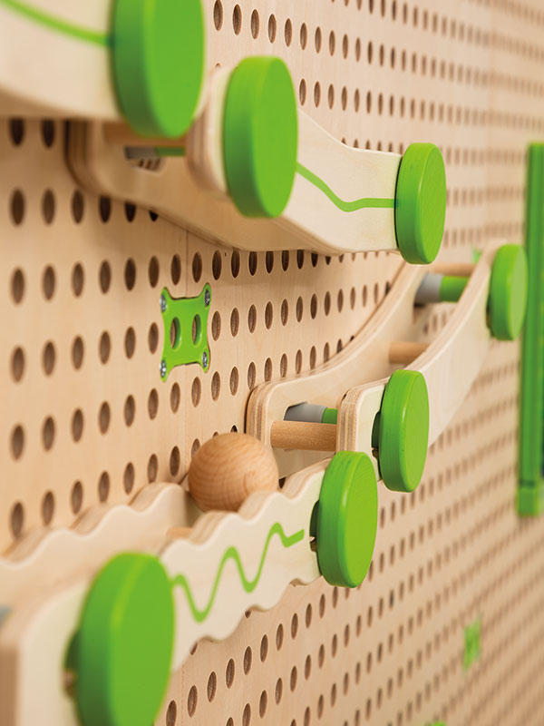 Durch das ausgeklügelte System, können die Kinder die Schienen-Elemente auf unterschiedliche Weise anbringen, man könnte sie auch auf den Kopf stellen und feststecken. Durch die ovalen Löcher werden die Schienen feinjustiert. Es gibt immer mehrere Möglichkeiten den Plug zu befestigen, um somit die Steigung und das Gefälle zu beeinflussen. Jetzt kann experimentiert werden, wie die Kugel am besten, schnellsten oder am leisesten läuft. Mit den 4 unterschiedlichen Schienen-Formen können die Kinder endlos viele Kombinationen stecken und dabei beochbachten, welche Schiene die Kugel schneller oder langsamer rollen lässt. Durch das sichere Rollen auf beiden Seiten der Schienen nimmt die Kugel nicht so stark Fahrt auf. So bleibt genug Zeit, die Kugel mit den Augen zu verfolgen. Hat sie genug Schwung, kann sie sogar auf die nächste Schiene springen.