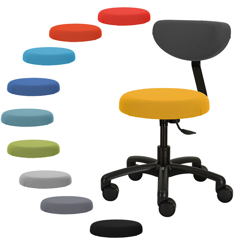Comfortable and ergonomic seating thanks to the large round seat (D: 37 cm) and the newly developed 360° rotating backrest. Safety and durability thanks to the black coated aluminum base and the unloaded braked comfort castors (Ø: 6 cm black), which can be used on all floors. But what is really new about it? New is the revised lumbar support, which can now be rotated 360° independently of the seat and, in addition to new dimensions (37 x 17 x 7 cm), now also has a 7 cm wide armrest. It is continuously adjustable in height and in 2 stages in depth. Also new is the increased load capacity from 120 kg to 150 kg, as well as the easy change of the seat and backrest covers by the user (if desired and selected). This saves costs when replacing worn-out covers, because your Leitner chair lasts much, much longer.